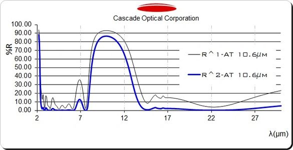 The above multiple reflection filter system was once again revisited in 2013, in order to contend with the opposite end of the spectrum. Here the customer required the filter to block out K, L, M and above 10.6µ. Since many materials absorb after 9µ and the blocking band is incredibly wide we, recommended an IR version of the above UV multi reflection system. Although more reflections are obviously better, due to space constraints, in their system, they were only able to accommodate 2 "bounces". But, given the graph to the right even 2 bounces, considerably, helps the S/N ratio